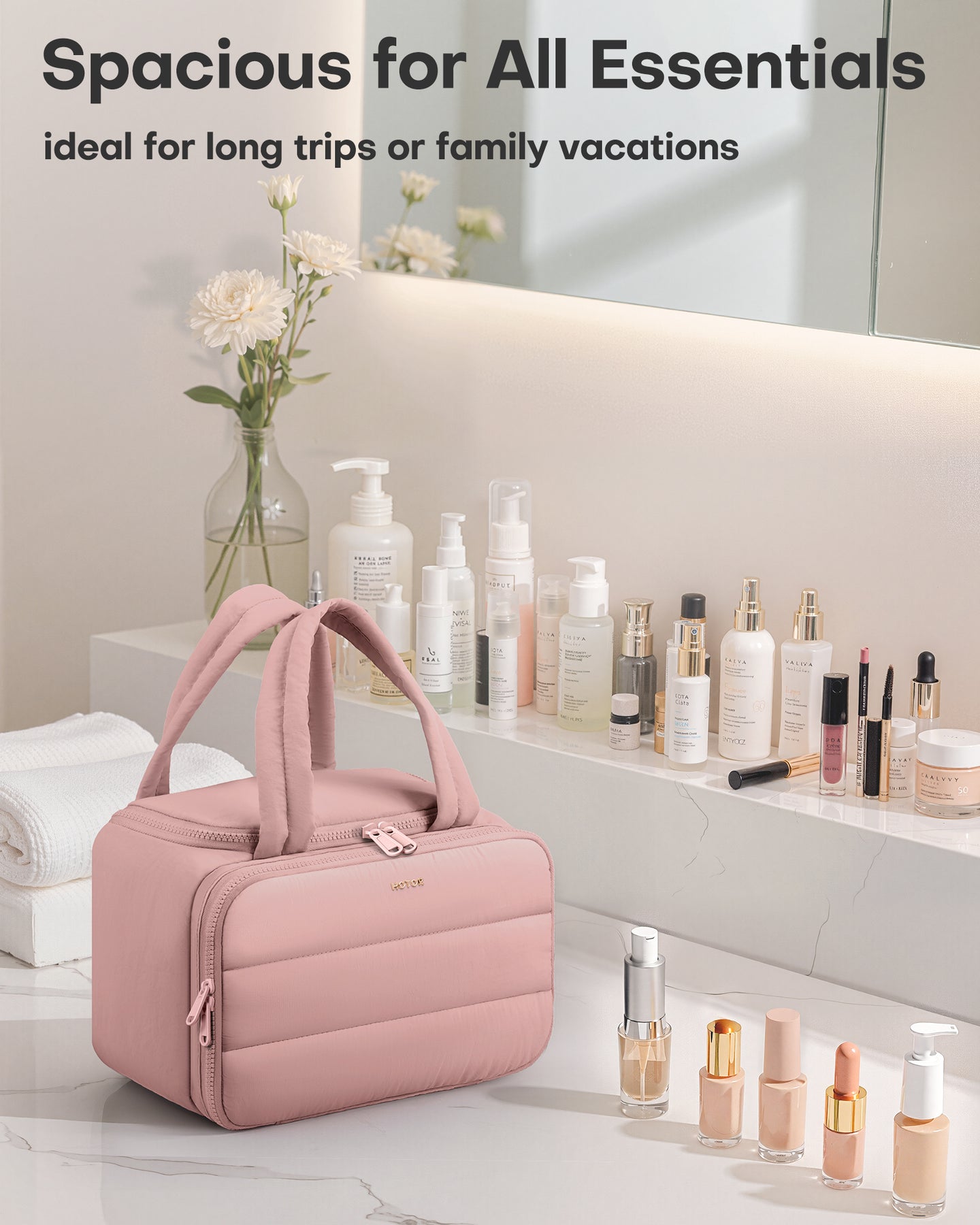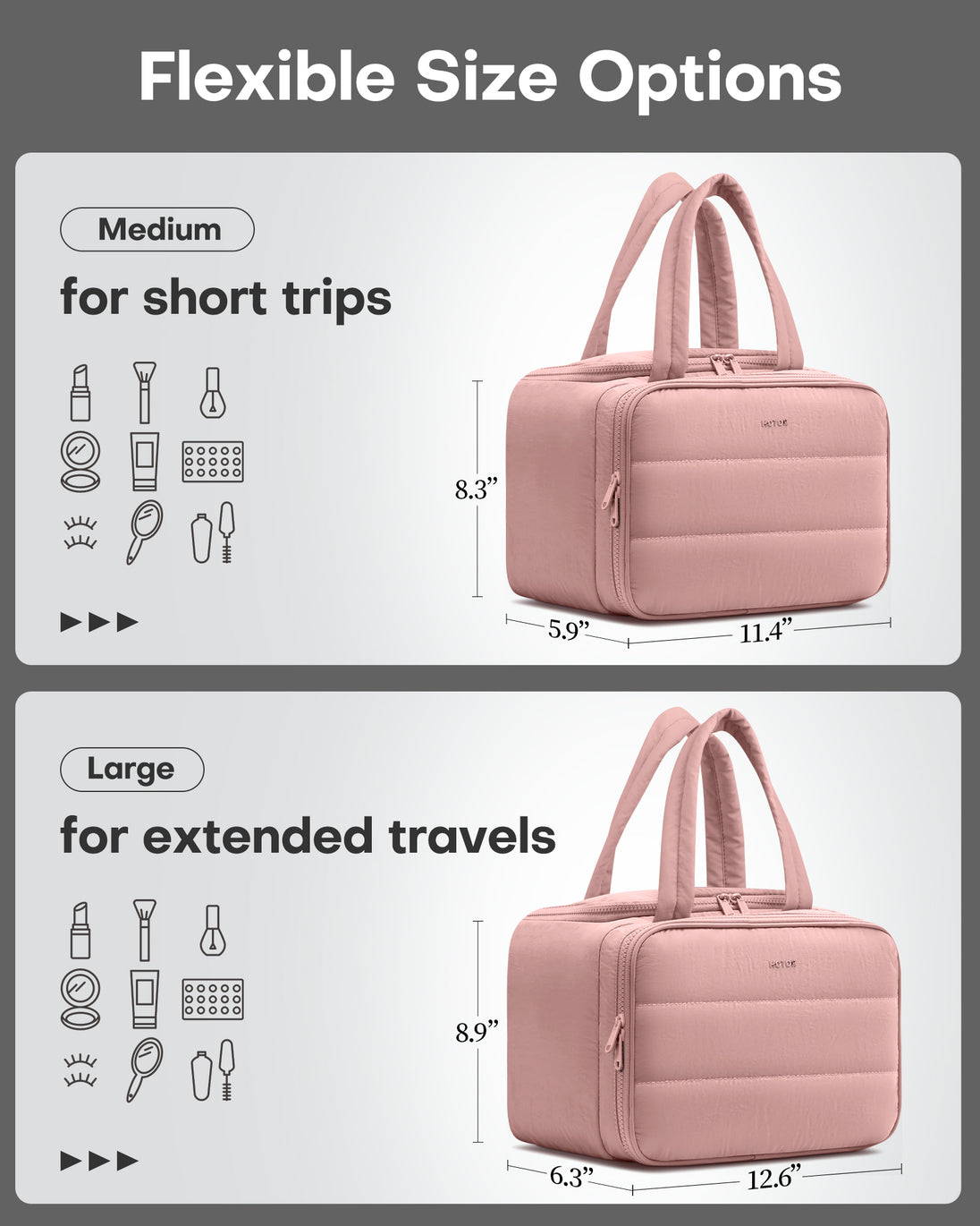- LARGE CAPACITY: Spacious 11.4" x 5.9" x 8.3" size with a removable divider in the main compartment. Easily fits large toiletry bottles or separates smaller items for organized storage.