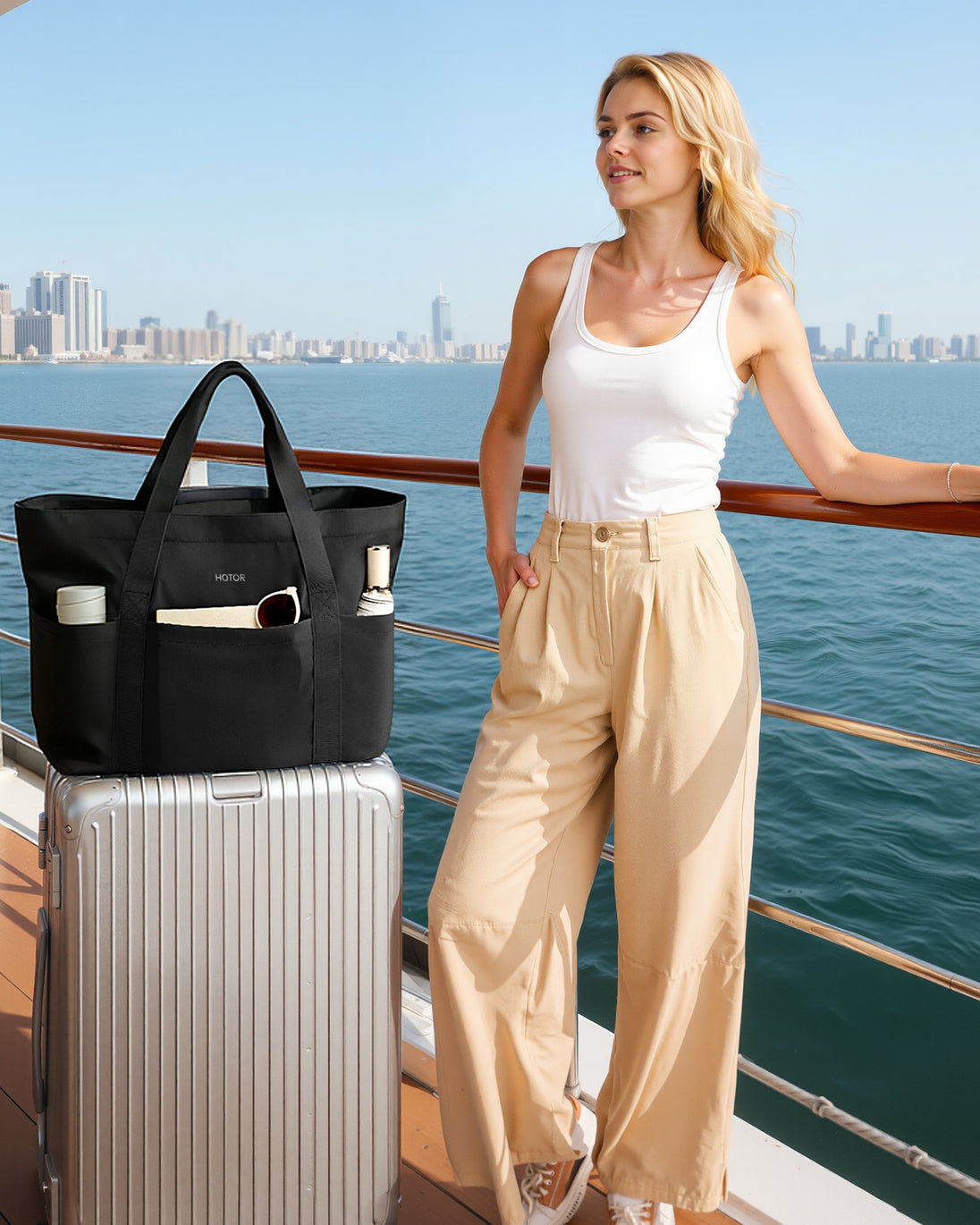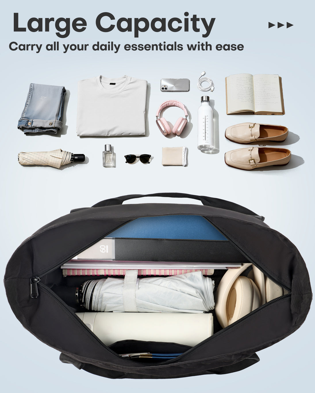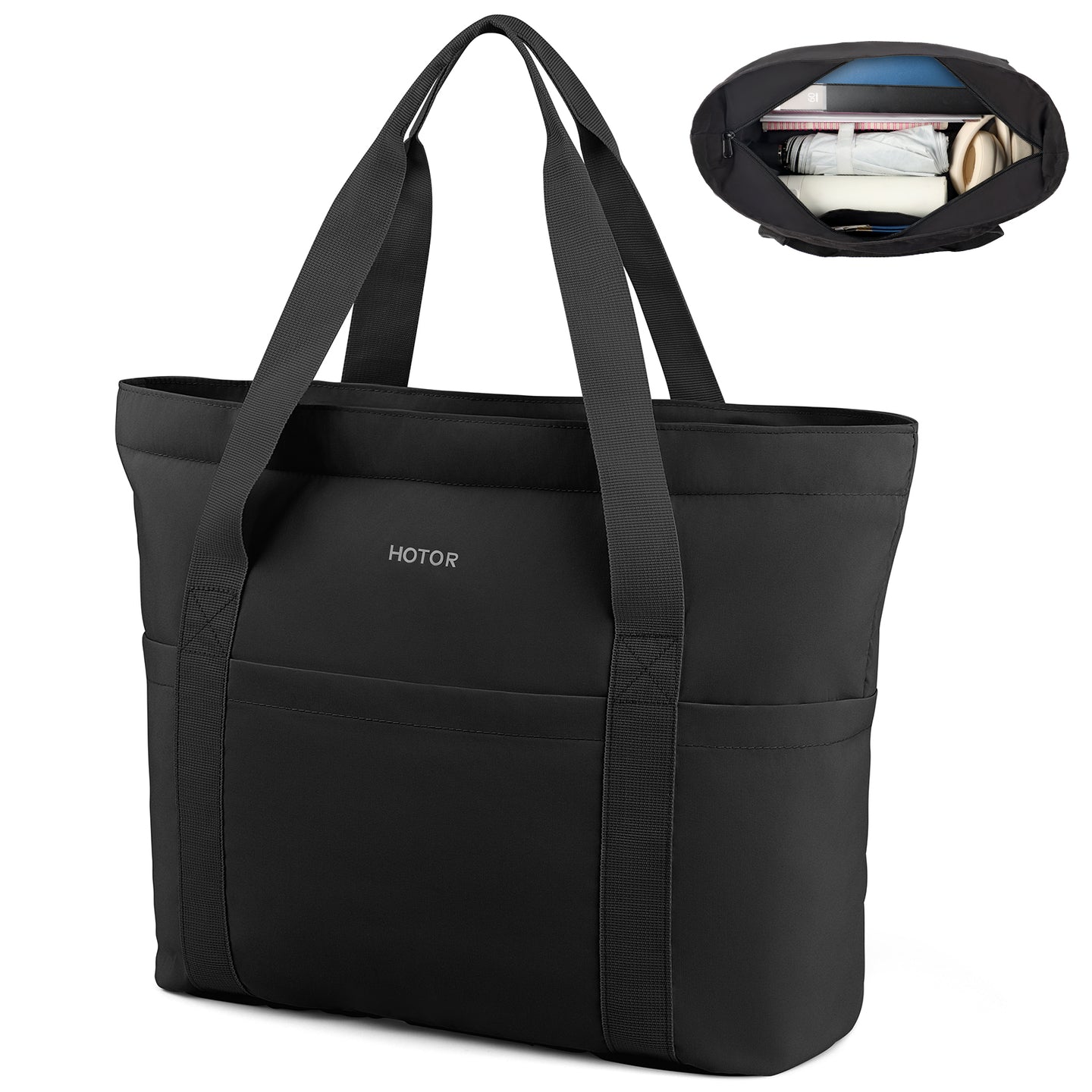 HOTOR Tote Bag for Women - Foldable Travel Bag with Zipper, Top Handle Handbag for Work, Gym, Travel, 19.7" x 6.7" x 13.8", Black