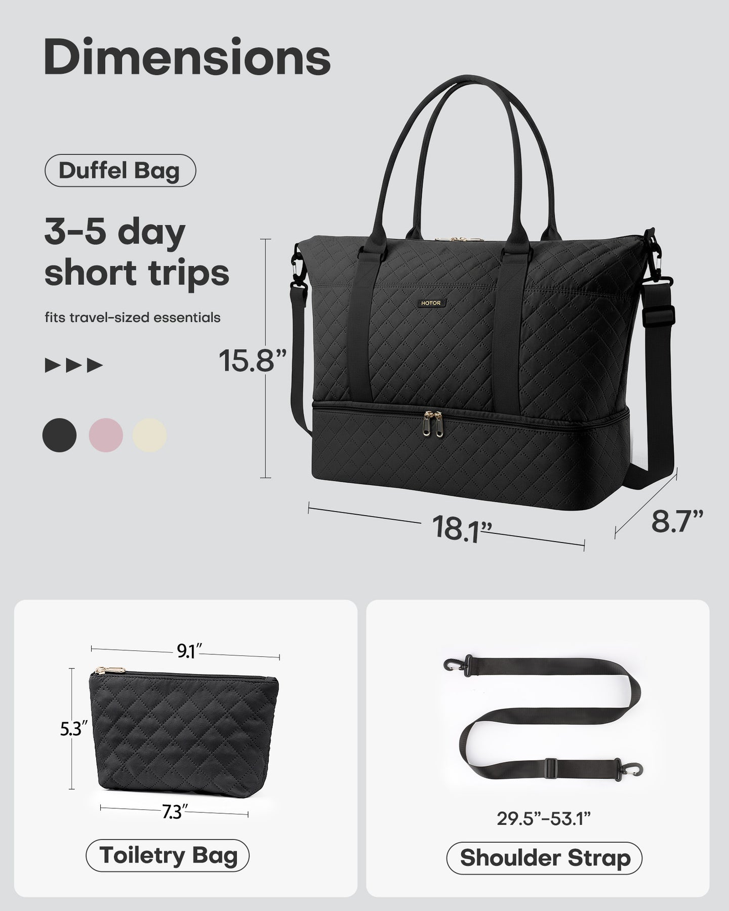 HOTOR Travel Duffel Bag, With Shoe Compartment, Carry-On Size, 13.4" x 17.3" x 7.9", Black