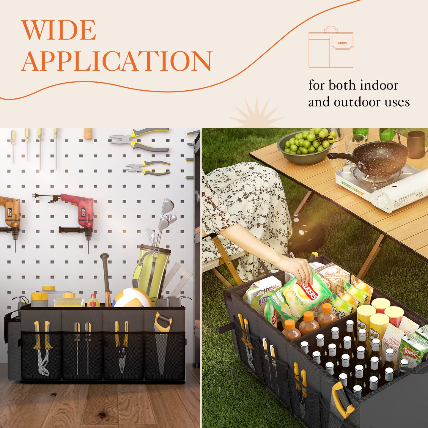 - VARIOUS APPLICATION: The HOTOR car storage organizer is suitable for various models, including SUVs, sedans, and trunks, helping you neatly store items in your car. Its portability makes it highly recommended for other uses as well. For example, you can use it in the garage as a tool bag to store tools and parts, or take it to a campsite as a temporary storage box. It is an ideal storage solution that can meet your needs on different occasions and help you keep your life tidy and organized.